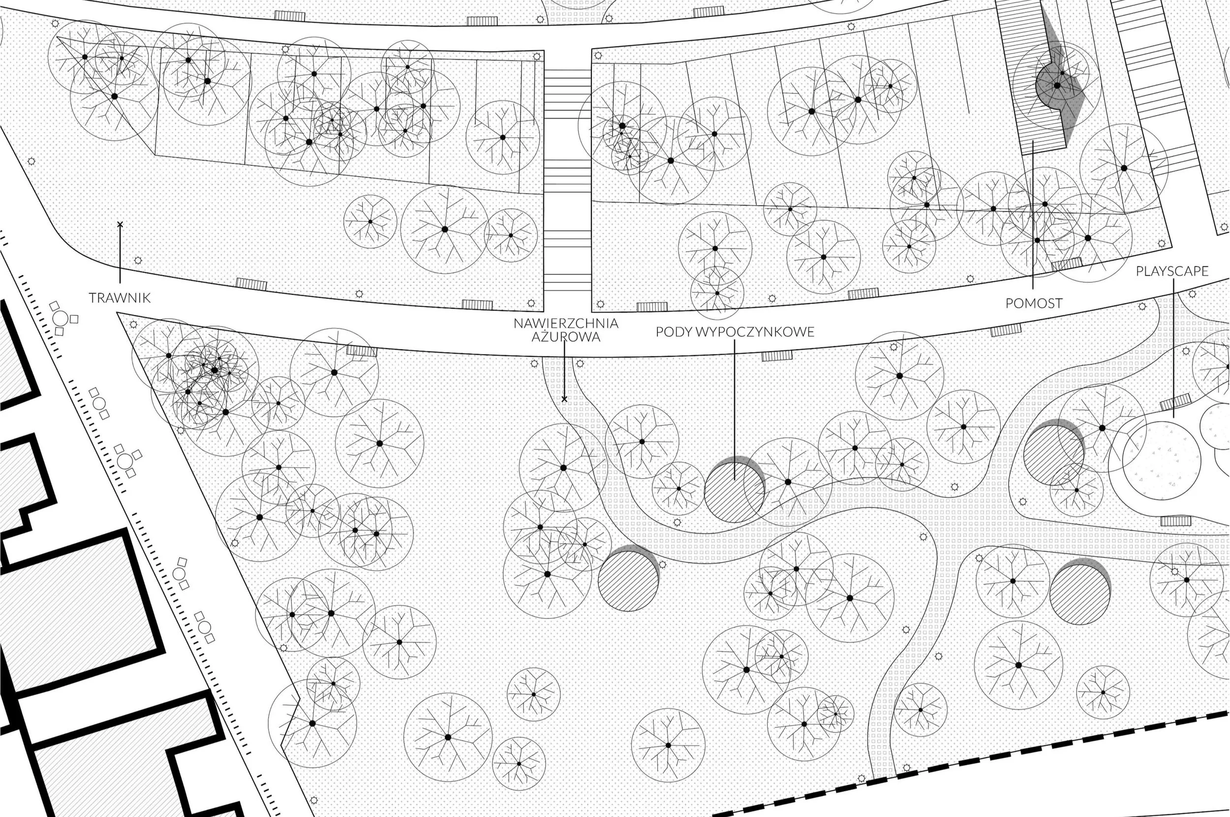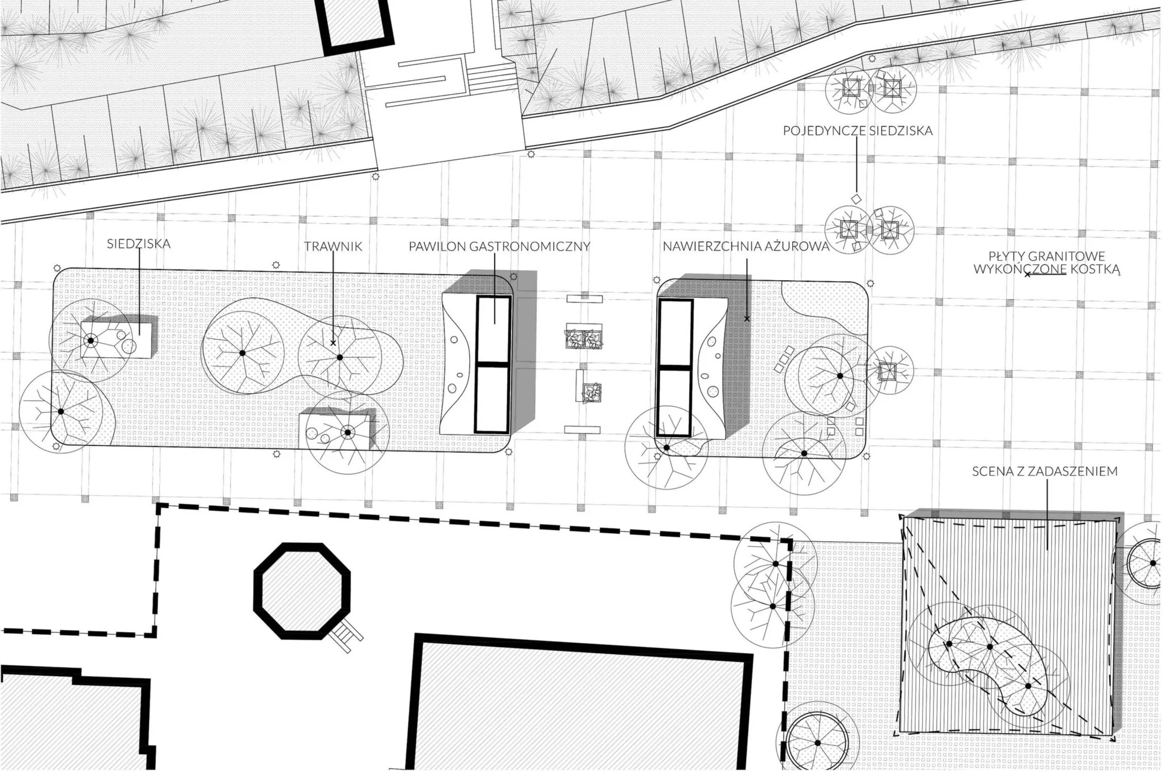 Proposed solutions align with the competition's requirements: a service building is designed to replace the existing ones, along with an underground parking facility. The entrance to the underground parking is proposed as a ramp partially within the roadway of Żeromskiego Street. This solution allows for a gentle descent into the parking area, which will be natural and clear for drivers approaching from Piłsudskiego Street. At the same time, it maximizes the use of the underground space for parking spots.