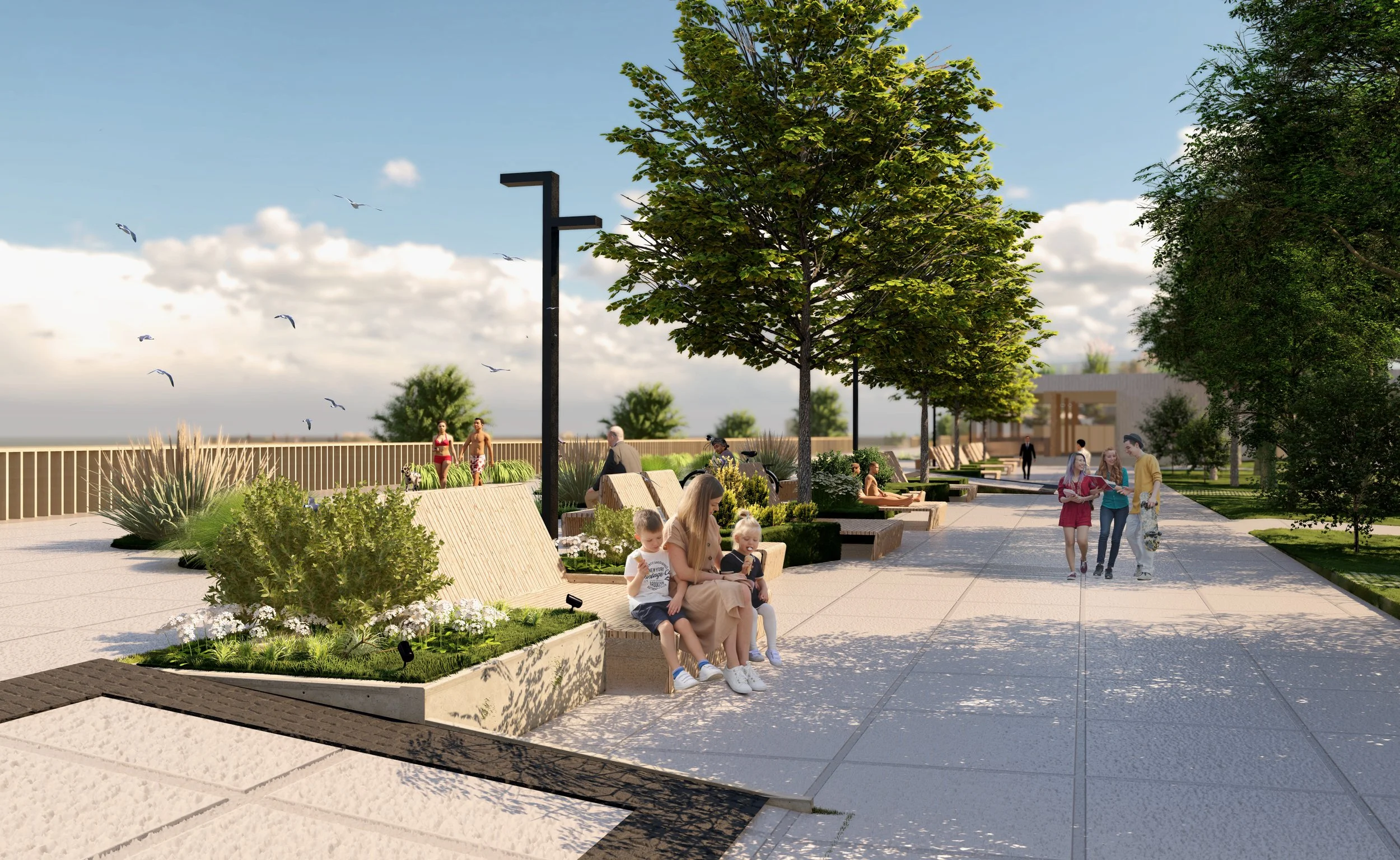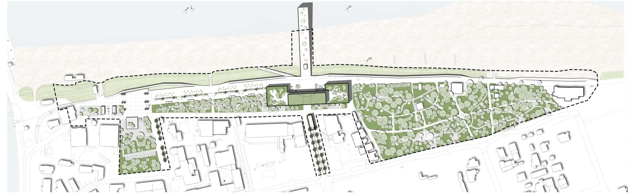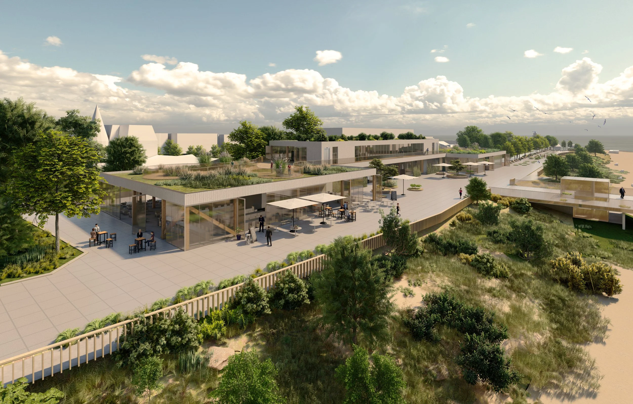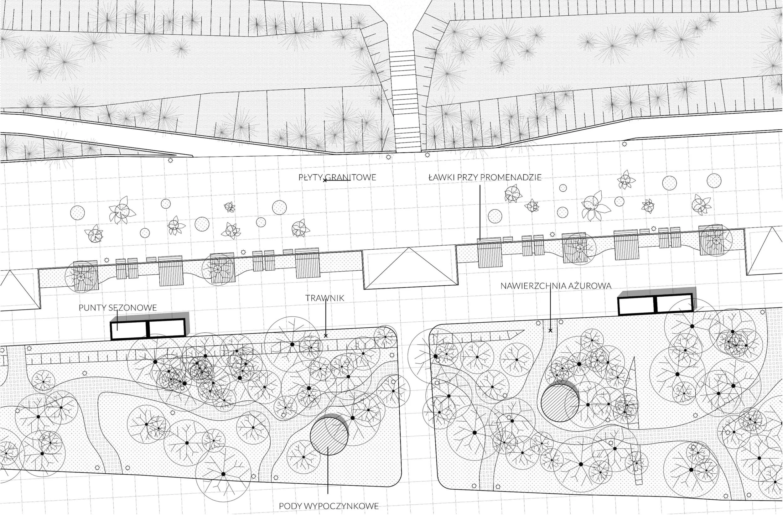 The main premise is to create a cohesive vision of an attractive and green seaside promenade in terms of aesthetics and spatial design. The direct proximity to existing and planned greenery, as well as the proximity to dunes and the sea, are considered the greatest values of the location. Planned interventions, including the outline of the proposed building, aim to preserve all existing trees. Attention has been paid to ensuring the maximum amount of biologically active surfaces and greenery. A seaside pier with the possibility of user integration and the presentation of artistic installations has been proposed. On the building's roofs, an extensive green roof has been proposed, along with local elements of small architecture with plantings of perennials and shrubs.