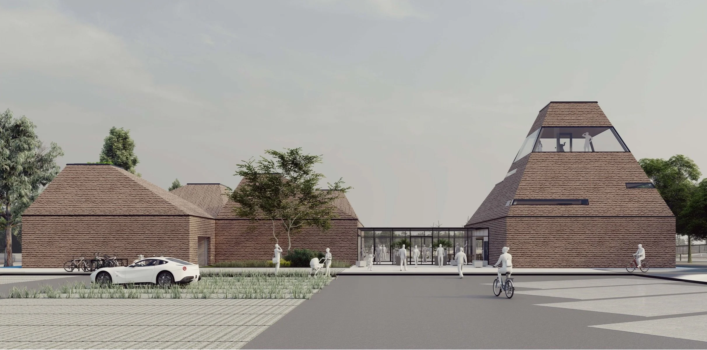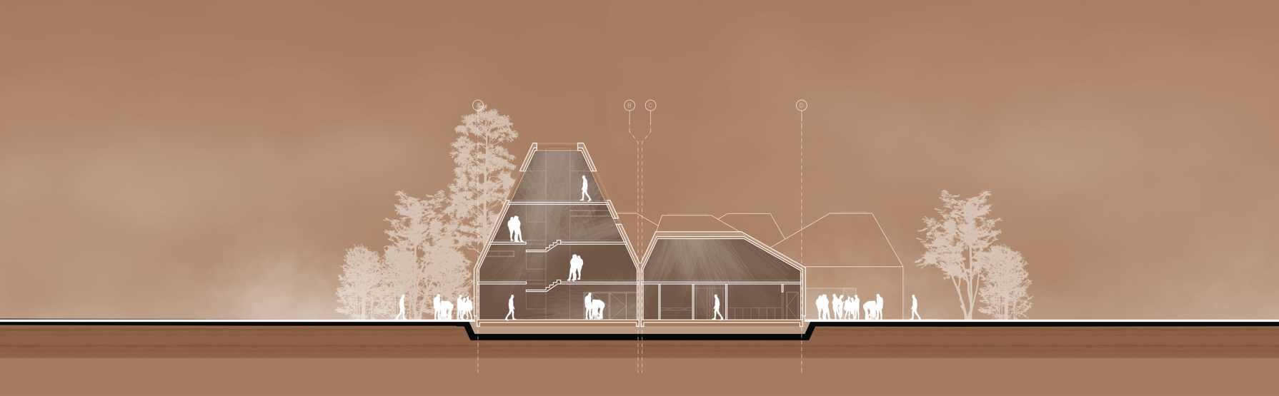 The planned interventions, including the outline of the designed building, assume the least possible interference with the site and the existing greenery. The lump of the building is a interpretation of the ancient form of a smokestack, a group of rectangular smokestacks whose truncated pyramidal roofs resemble the chimneys so characteristic of the Silesian landscape.