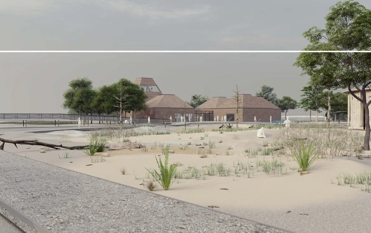 The development of the site involves the paving and resurfacing of the car park, the creation of a small paved area behind the building, a footbridge leading over the peat bog and two loops of paths, the first a gravel path running on the ground and the second suggested by laying down materials located on the ground which leads to the last surviving section of the dune.