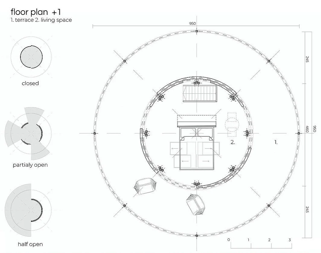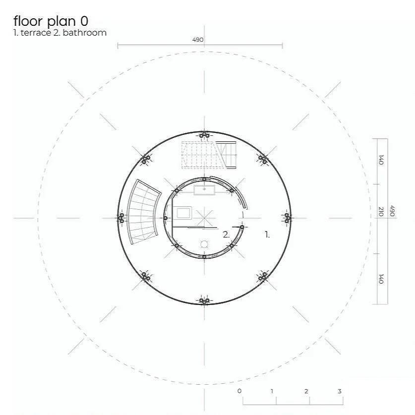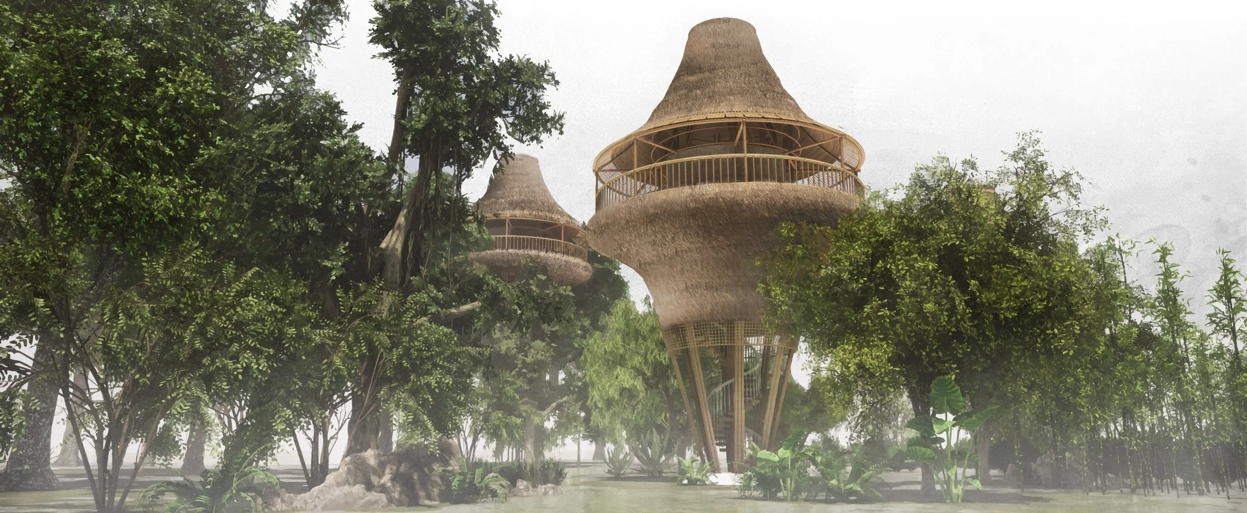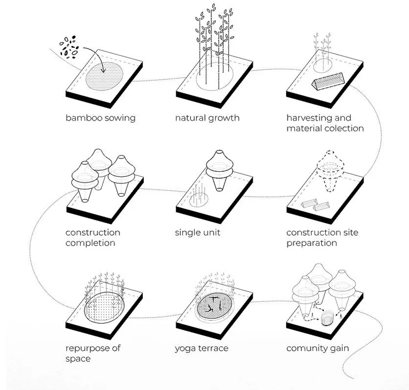 Raising the building on stilts references traditional Khmer architecture while also minimizing ground disturbance. The circular layout provides flexibility in positioning the buildings, allowing them to seamlessly integrate into natural clearings between trees, regardless of their orientation to the cardinal directions. This design makes the structures part of the surrounding landscape, offering a sense of privacy and seclusion from the outside world. The open floor plan, combined with the ability to open up to all sides, allows users to fully immerse themselves in the surrounding greenery.
